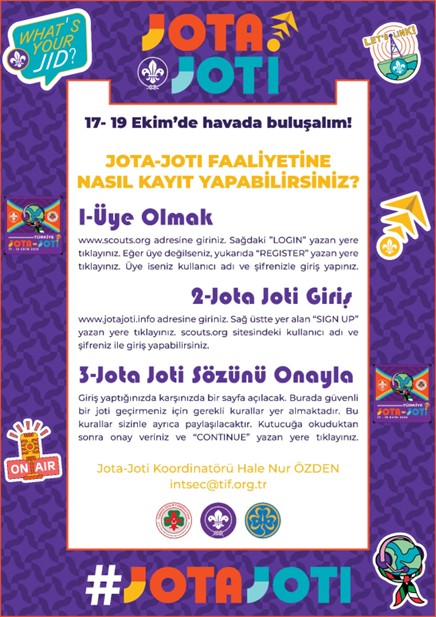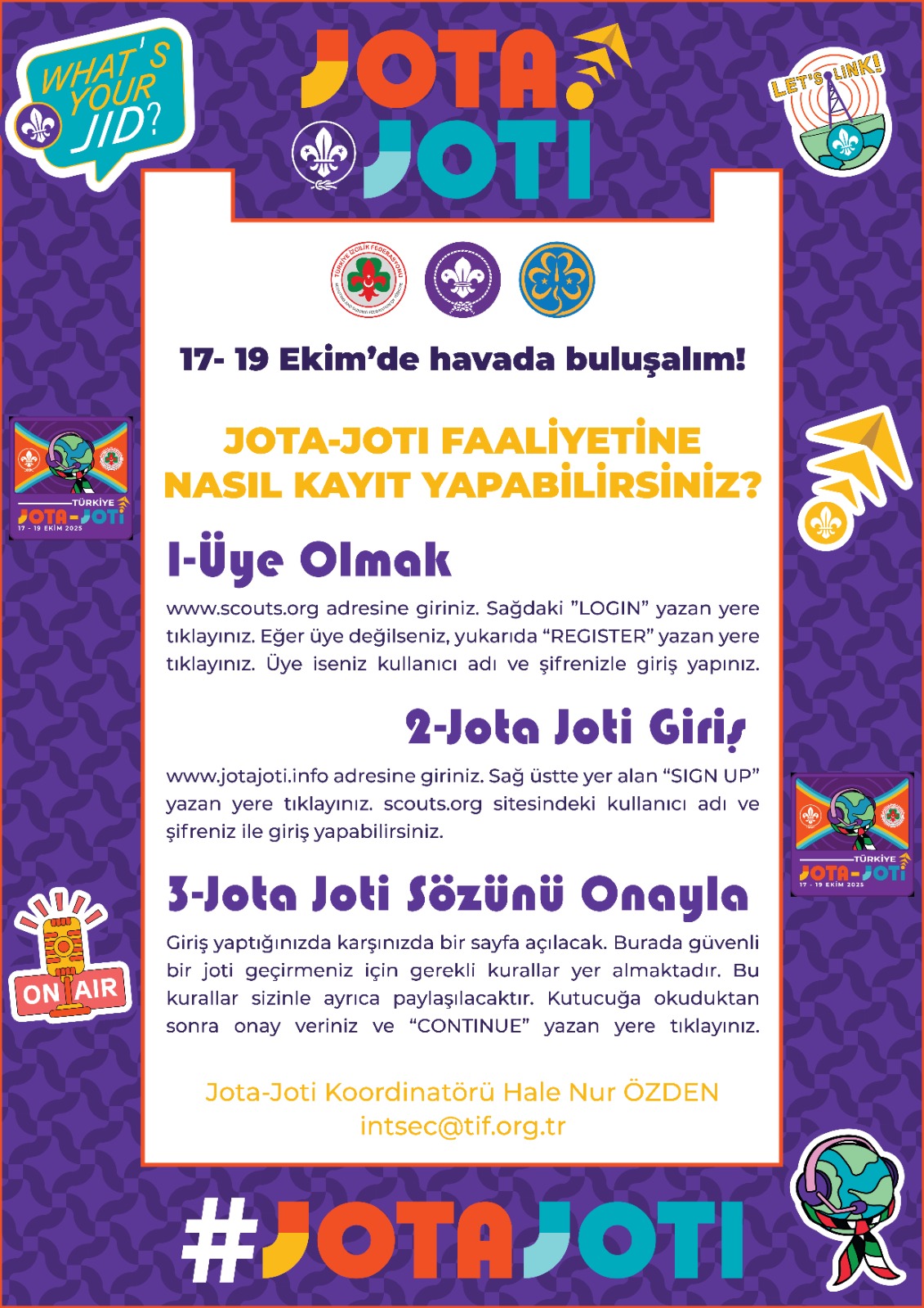 3-Kulüpler jota için almış oldukları özel gün çağrı işaretlerini ve hangi frekansta jota yapacaklarını intsec@tif.org.tr adresine iletmelidir. 2025 Jota için özel çağrı işareti almamış olup faaliyete katılacak olan kulüpler faaliyete yardımcı olacak radyo amatörünün kullanacağı çağrı işaretini yine aynı adrese e-posta olarak göndermelidir.